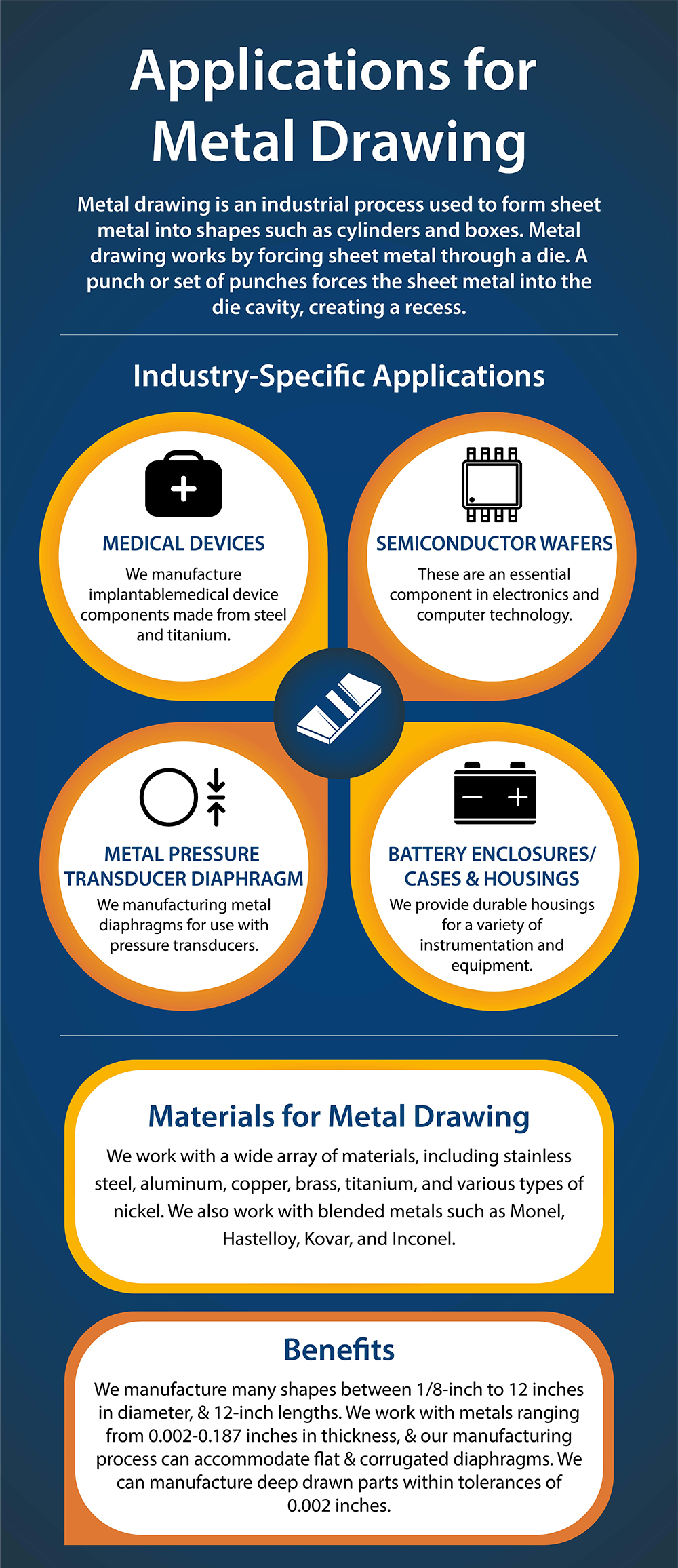 We manufacture round, square, rectangular, and asymmetrical shapes between ⅛-inch to 12 inches in diameter, as well as 12-inch lengths. We work with metals ranging from 0.002-0.187 inches in thickness, and our manufacturing process can accommodate both flat and corrugated diaphragms. We are capable of manufacturing deep drawn parts within tolerances of +/- 0.002 inches.